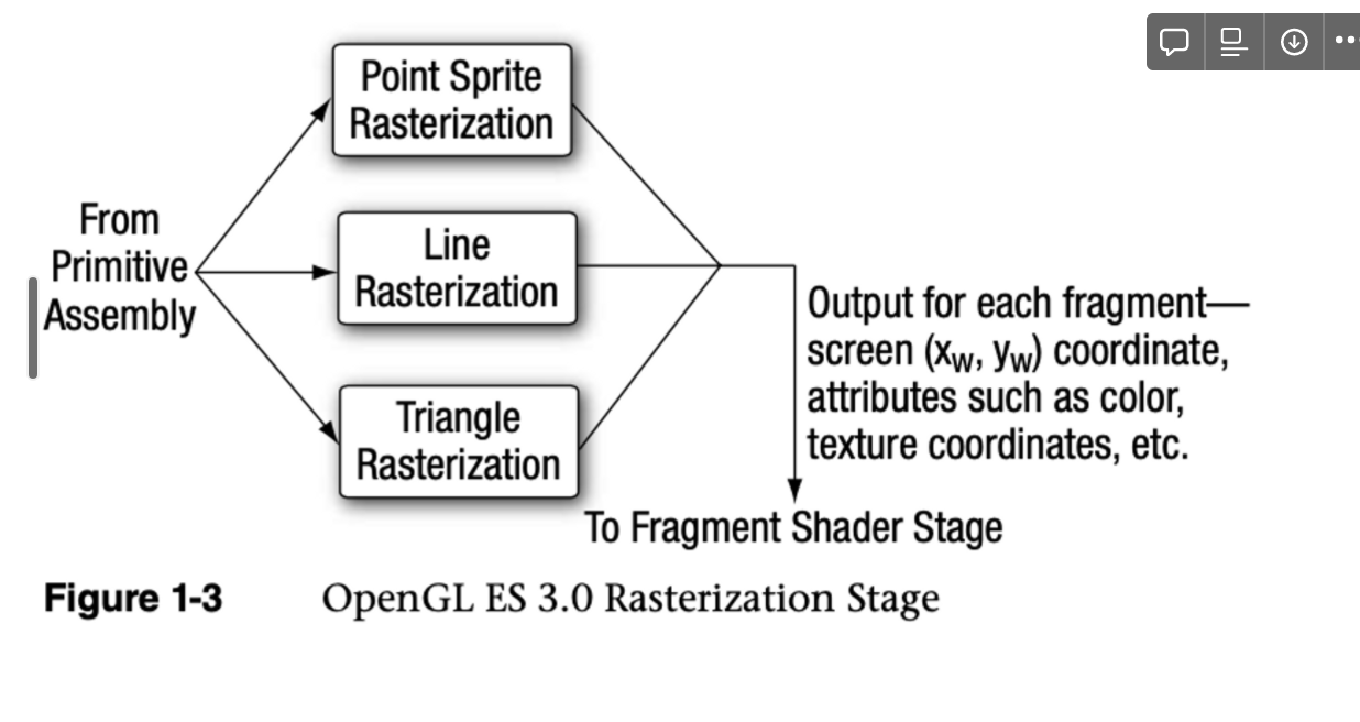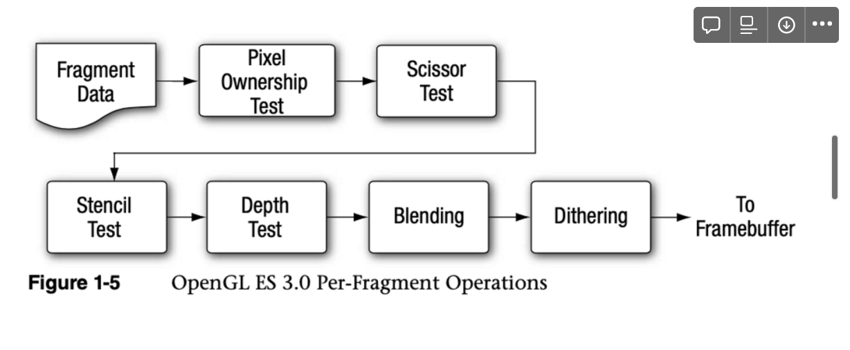 - 이 output = rasterization 단계에서 생성된 색상, depth, stencil, 화면 좌표 위치(xw, yw)가 input인 결과, opengl es 3.0 pipeline의 fragment operations stage가 됨.