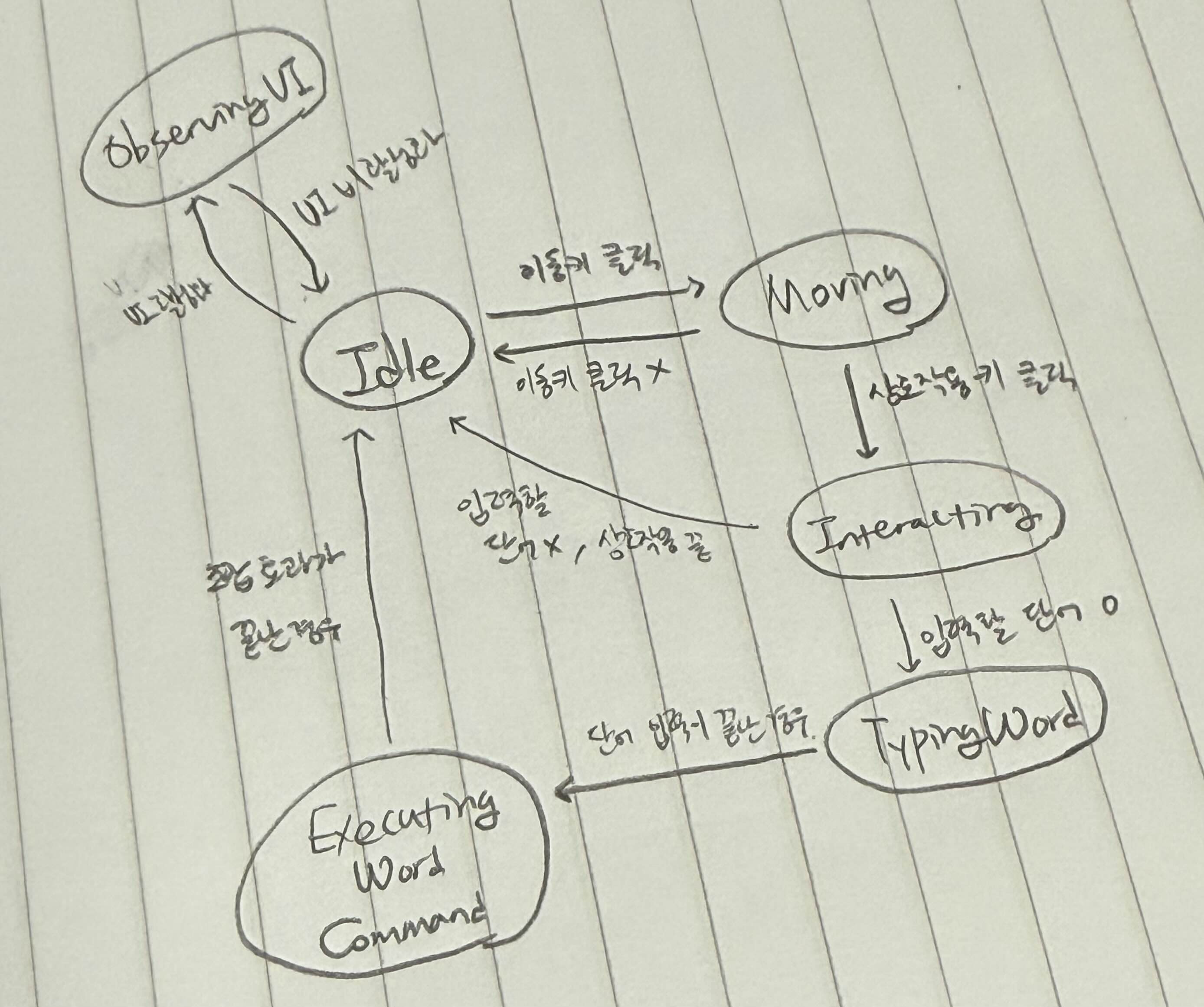 플레이어의 상태 별로 발생하는 상호작용이 명확하고, 입력 중에도 조합을 완료해 실행하거나 취소해야 한다. 또한 상호작용 중 또 다른 상호작용이 일어나면 안되므로 현재 상태에 허용되는 행동을 명확히 제어해야 한다.